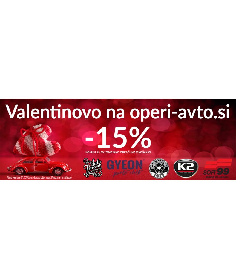 Ne spreglejte posebne valentinove akcijske ponudbe v kateri si lahko zagotovite izdelke blagovnih znamk Auto Finesse, Gyeon Quartz, Chemical Guys, K2 Car Care in Soft99 kar 15% ugodneje. Akcija je veljavna le v sredo, 14.2.2018. Izdelke izbranih blagovnih znamk si lahko ogledate na spodnjih povezavah.
