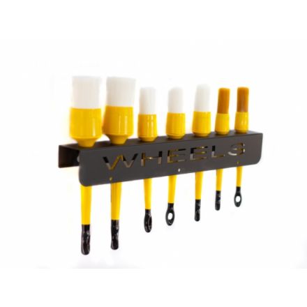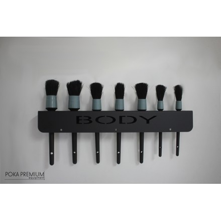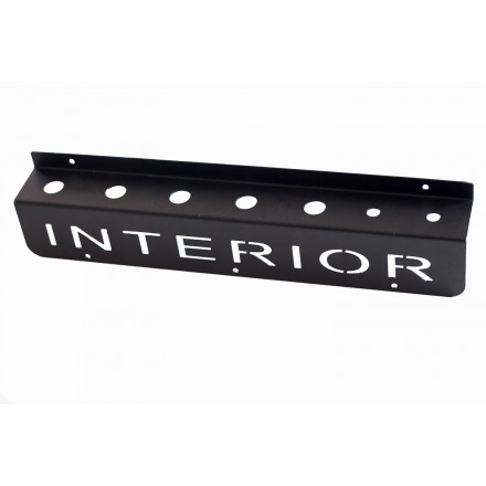 Stenski nosilec za detailing čopiče. Prašno barvan, izdelan iz kvalitetne 1,5mm debele pločevine. Možnost izbire različnih napisov (Interior, Exterior, Wheels) za lažje ločevanje.