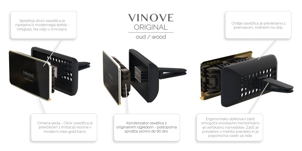 Francoska linija avtomobilskih parfumov VINOVE zagotavlja prefinjeno kombinacijo dišavnih not. Vaše vozilo bo dobilo dodaten pridih elegance.
