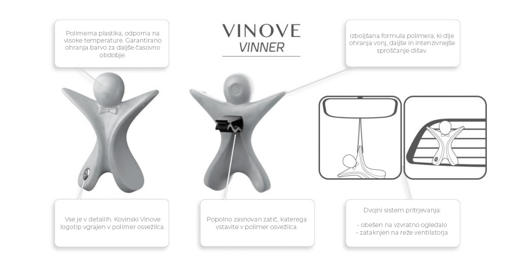 Avtomobilski osvežilci Vinove so obstojni do 90 dni. Diskretni vonj se počasi sprošča zaradi koncentriranih dišavnih esenc in tehnološko naprednih polimerov, ki se uporabljajo kot sredstvo za aromo.