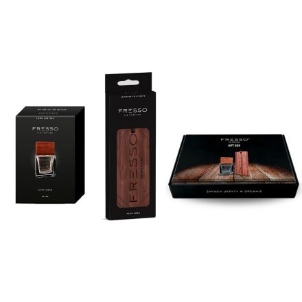 Edinstvene Fresso dišave sedaj na voljo tudi v darilnem kompletu, ki bo idealno darilo za vsakega, ki si prijeten vonj v vozilu. Komplet vsebuje eno Dišavo Fresso Parfume 50ml v steklenički in dve obešanki Fresso Hanger.