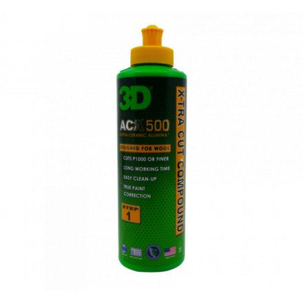 3D ACA X-TRA 500 je nova polirna pasta za groba in srednje groba poliranja. konstruirana za uporabo posebej v kombinaciji z volnenimi ali mikro gobicami. Poznana je pod kratico 3D 500. Omogoča izjemno korekcijo v zelo kratkem času. Vsebuje najnovejše in moderne abrazive " Alpha Ceramic" kateri omogočajo bistveno daljši čas same obdelave od konvencionalnih polirnih past. Pasta je primerna za vse vrste avtomobilskih lakov. Ne vsebuje polnil. Iz površine jo odstranimo sila enostavno z namenskimi sredstvi za odstranjevanje polirnih past. Pasto lahko uporabljamo z vsemi vrstami strojev, tako DA, kot rotacijskimi. Za seboj pušča izjemen sijaj površine. Pasta je idealna za uporabo v kombinaciji za pasto za finiširanje 3D ACA 520 ali 3D ONE Hybrid. Zaradi svoje tehnologije izjemno pozne cepitve abrazivnih delcev je izjemno ekonomična saj je poraba paste izjemno majhna. Pasta se ne praši in jo sila enostavno obrišemo iz površine. Priporočamo uporabo v kombinaciji z trdimi oz. grobimi penastimi polirnimi gobicami. Še posebej se priporoča za uporabo v kombinacijami z gobicami iz mikro vlaken ali iz merino volne.
