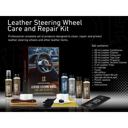 Leather expert Steering Wheel Kit je priročen komplet za obnovo in nego usnjenih volanskih obročev. Vsebuje vse kar potrebujete za popravilo in nego. Komplet je pripravljen za uporabo.