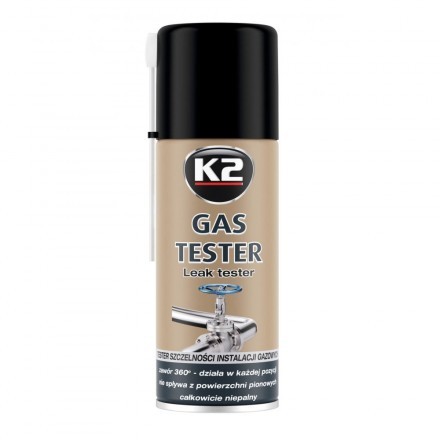 K2 Gas tester je sredstvo namenjeno za testiranje uhajanja plina in zraka. Primeren za vse industrijske aplikacije. Specialna tekočina, ki ne kaplja omogoča hitro in enostavno ugotavljanje puščanja oz. uhajanja plinov ali zraka. Primeren za plastične in kovinske sisteme. Posebaj se priporoča za testiranje uhajanja LPG v vozilih, za vulkanizerske delavnice in onevmatske sisteme. Ne povzroča korozije. Ni gorljiv in eksploziven.