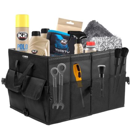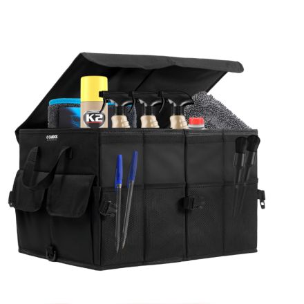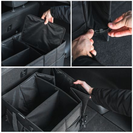 Zahvaljujoč ojačanim ročajem in togi strukturi je prenašanje organizatorja z njegovo vsebino hitro in priročno. Še več, ko ga ne uporabljate, ga je mogoče zložiti, kar prihrani prostor v prtljažniku.