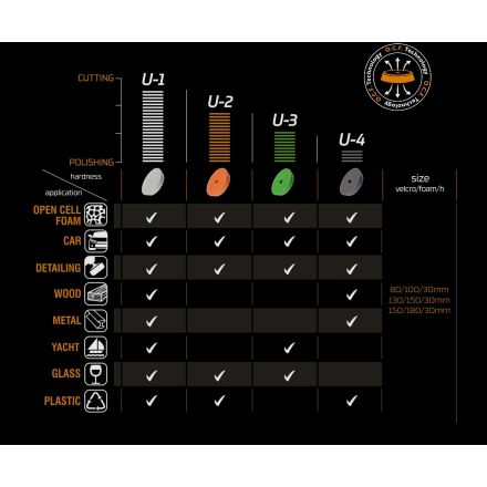 Zelena blazinica serije U je vsestransko orodje s srednje fino rezalno silo in odlično končno obdelavo. Deluje odlično: Za predhodno poliranje mehkih in zelo mehkih barv. Pri enostopenjskih barvnih popravkih (enostopenjski). Zaradi vsestranskosti in udobja uporabe je nenadomestljiv pri večstopenjskih popravkih barve.