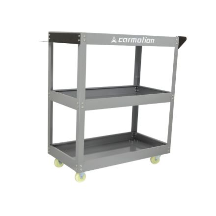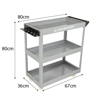 Mobilni voziček za orodje s 3 policami. Dodatno ima voziček držalo za različne vrste drobnega orodja, kot so izvijači. Voziček ima 2 vrtljivi kolesi in 2 fiksni kolesi.