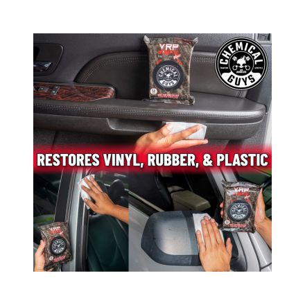 Chemical Guys VRP Protectant wipes so mokri robčki, prepojeni s posebnim sredstvom kateri obnavlja, poživlja in zaščiti vse vinilne, plastične in gumijaste površine. Površina je po nanosu popolnoma suha na otip. Površine zaščiti pred škodljivimi UV žarki, umazanijo in prahom, obenem pa jim povrne lep videz. Primeren je za vse, ki želijo površine z sijajem. Paket vsebuje 50 navlaženih robčkov dimenzije 17,8 x 12,7 cm. Pakirano v dispenzer pakiranju.