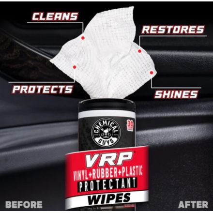 Chemical Guys VRP Protectant wipes so mokri robčki, prepojeni s posebnim sredstvom kateri obnavlja, poživlja in zaščiti vse vinilne, plastične in gumijaste površine. Površina je po nanosu popolnoma suha na otip. Površine zaščiti pred škodljivimi UV žarki, umazanijo in prahom, obenem pa jim povrne lep videz. Primeren je za vse, ki želijo površine z sijajem. Paket vsebuje 30 navlaženih robčkov. Pakirano v dispenzer pakiranju.